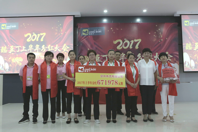 貝升布藝有限公司領取分紅現(xiàn)金并與酷豆丁董事長合影留念