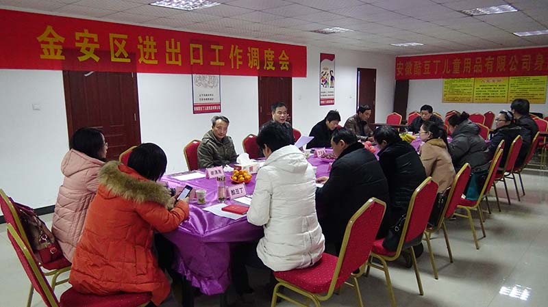 12月24日,金安區(qū)進(jìn)出口工作調(diào)度會(huì)在安徽酷豆丁兒童用品有限公司召開。副區(qū)長(zhǎng)王務(wù)兵、商務(wù)局局長(zhǎng)金宗武及金安區(qū)十幾家外貿(mào)骨干企業(yè)負(fù)責(zé)人參加了會(huì)議。