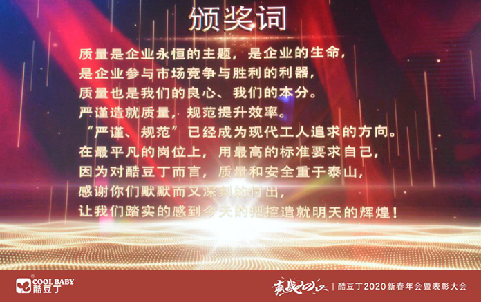 致辭結(jié)束后2019年度表彰環(huán)節(jié),品牌運(yùn)營部趙越總監(jiān)宣讀年度表彰的質(zhì)量標(biāo)兵、優(yōu)秀個(gè)人獎(jiǎng)項(xiàng)及優(yōu)秀部門和優(yōu)秀管理者頒獎(jiǎng)詞,67名受表彰的優(yōu)秀個(gè)人和2個(gè)受表彰的優(yōu)秀部門上臺領(lǐng)獎(jiǎng)。