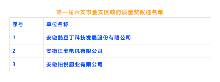 根據(jù)《六安市金安區(qū)政府質(zhì)量獎(jiǎng)管理辦法》(金政秘﹝2019﹞87號(hào))、《關(guān)于申報(bào)第一屆六安市金安區(qū)人民政府質(zhì)量獎(jiǎng)的通知》(金質(zhì)委辦﹝2020﹞1號(hào)),區(qū)質(zhì)量發(fā)展委員會(huì)辦公室組織開(kāi)展了第一屆區(qū)政府質(zhì)量獎(jiǎng)申報(bào)和評(píng)審工作。在申報(bào)單位自愿申請(qǐng)的基礎(chǔ)上,經(jīng)資格審查、資料評(píng)審、現(xiàn)場(chǎng)評(píng)審等環(huán)節(jié),確定3家企業(yè)為第一屆六安市金安區(qū)政府質(zhì)量獎(jiǎng)候選單位。現(xiàn)將名單予以公示,廣泛聽(tīng)取意見(jiàn),接受社會(huì)監(jiān)督。公示期自2020年12月15日至2020年12月24日。有關(guān)意見(jiàn)和建議,請(qǐng)?jiān)诠酒趦?nèi)以電話(huà)、傳真、電子郵件或信函等形式向金安區(qū)質(zhì)量發(fā)展委員會(huì)辦公室反映(信函以到達(dá)日郵戳為準(zhǔn))。反映意見(jiàn)請(qǐng)用真實(shí)姓名、單位,并注明聯(lián)系方式。