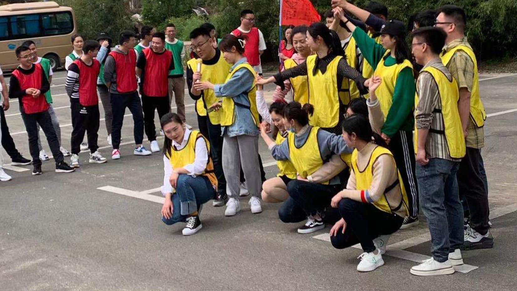 下午13:30分整個(gè)100人團(tuán)隊(duì)準(zhǔn)時(shí)出發(fā)來(lái)到了位于張店鎮(zhèn)大別山虛谷溫泉度假酒店。活動(dòng)開(kāi)始前,為讓大家忘記身份、忘記年齡,以空杯狀態(tài)積極參與訓(xùn)練,教練帶領(lǐng)大家完成第一項(xiàng)課程“活動(dòng)身心及自我介紹”。之后在10分鐘內(nèi)參訓(xùn)人員高效完成分組,成立了農(nóng)夫山泉隊(duì)、青春瀟灑隊(duì)、乘風(fēng)破浪隊(duì)、什么都隊(duì)和綠的發(fā)慌隊(duì),創(chuàng)建了隊(duì)旗、口號(hào)、隊(duì)歌,并進(jìn)行了宣誓和隊(duì)列PK。
