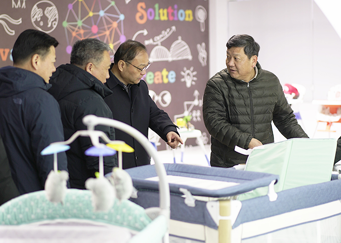 在產(chǎn)品展廳,束學龍一行對酷豆丁獲得中國優(yōu)秀工業(yè)設計獎金獎提名的“一鍵收合嬰兒床”(P100H)和獲得安徽省工業(yè)設計大賽金獎的“全地形嬰兒車”(S305)進行了詳細了解,并提出相關建議。