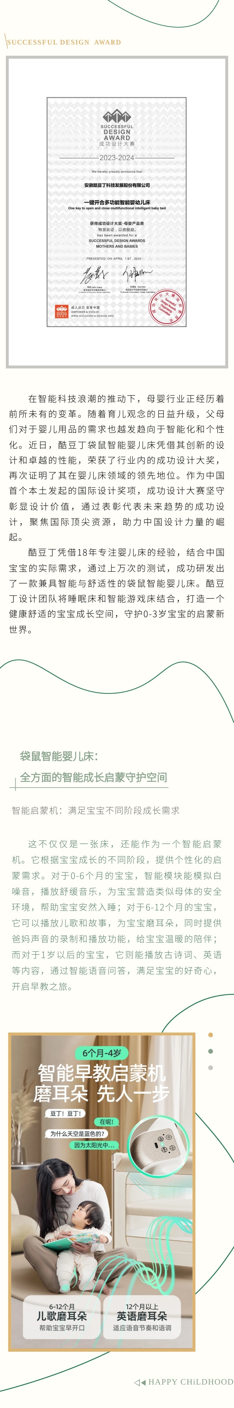 再獲榮譽(yù)!酷豆丁智能嬰兒床斬獲成功設(shè)計(jì)大獎(jiǎng)