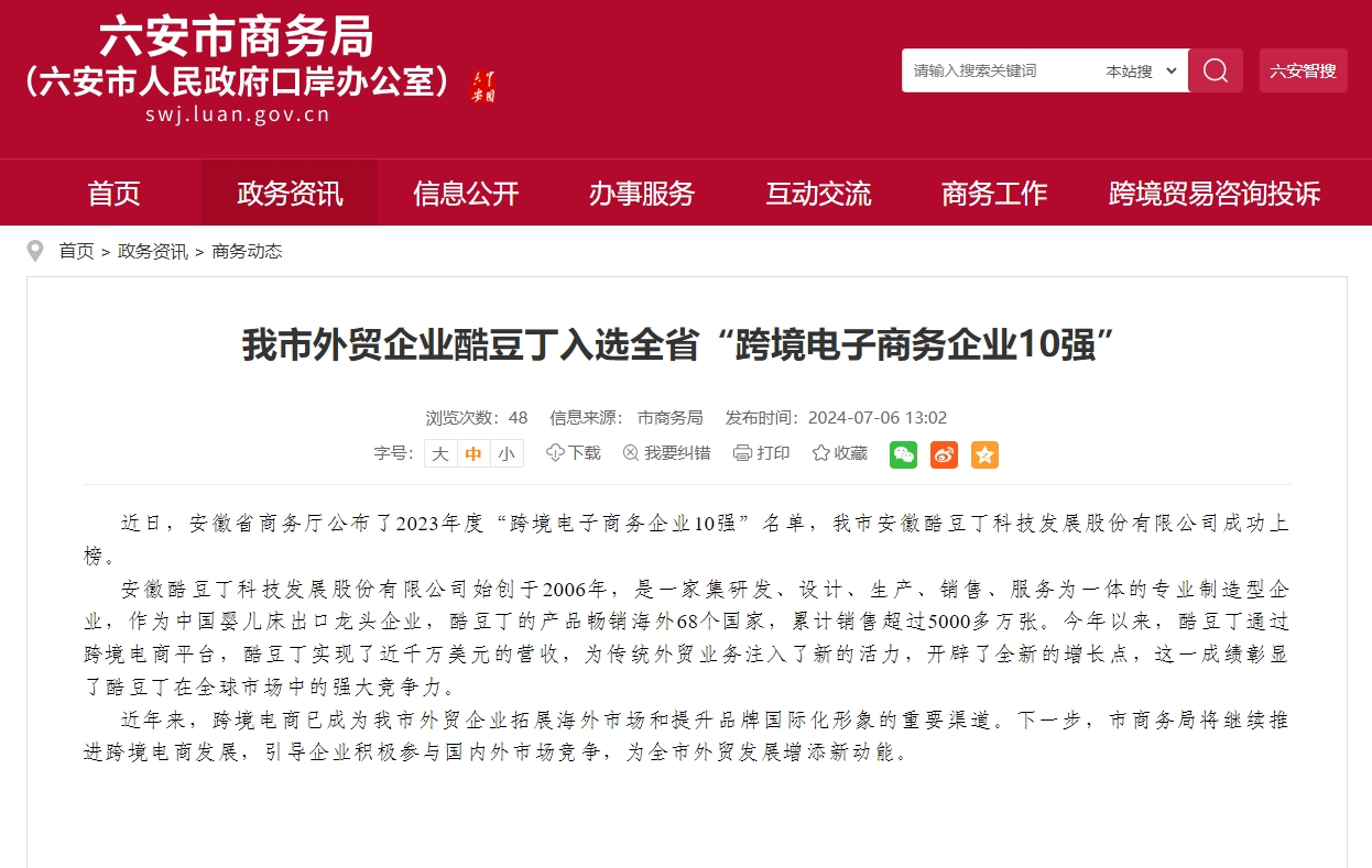 7月6日,根據(jù)《安徽省商務(wù)廳關(guān)于認(rèn)定跨境電子商務(wù)及海外倉(cāng)示范企業(yè)( 2023年度)的通知》(皖商辦貿(mào)發(fā)〔2024〕176號(hào)),安徽酷豆丁科技發(fā)展股份有限公司成功上榜2023年度“跨境電子商務(wù)企業(yè)10強(qiáng)”名單,成為六安市唯一一個(gè)成功上榜的外貿(mào)企業(yè)。