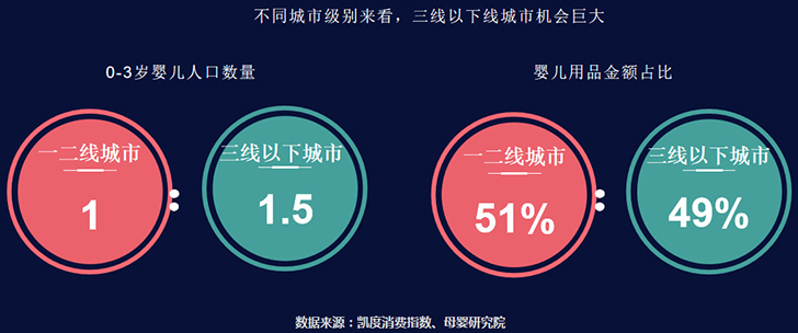 同樣純線上購(gòu)買(mǎi)的消費(fèi)者非常少,絕大部分是全渠道購(gòu)買(mǎi),同時(shí)線上線下購(gòu)買(mǎi)的人均消費(fèi)是僅在線下購(gòu)買(mǎi)的1.2倍。另外,一二線城市和三線以下的城市對(duì)比,0~3歲的嬰兒人口的數(shù)量是1:1.5,可以看三線以下的城市是巨大的金礦,而且嬰兒用品的消費(fèi)金額比幾乎是1:1,這是一個(gè)巨大的藍(lán)海。
