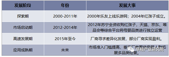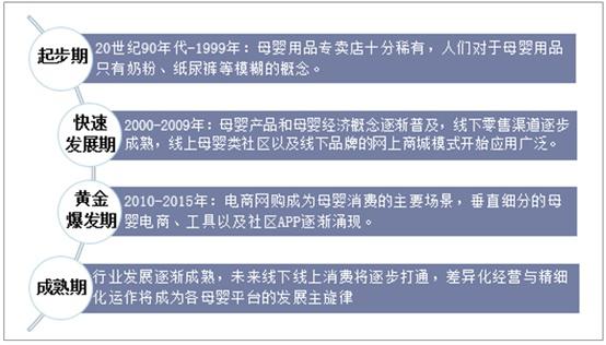 中國母嬰行業(yè)發(fā)展經(jīng)歷了四個階段,分別是起步期、快速發(fā)展期、黃金爆發(fā)期及成熟期。當(dāng)前母嬰行業(yè)發(fā)展逐漸成熟,未來線下線上消費將逐步打通,差異化經(jīng)營與精細(xì)化運作將成為各母嬰平臺的發(fā)展主旋律。
