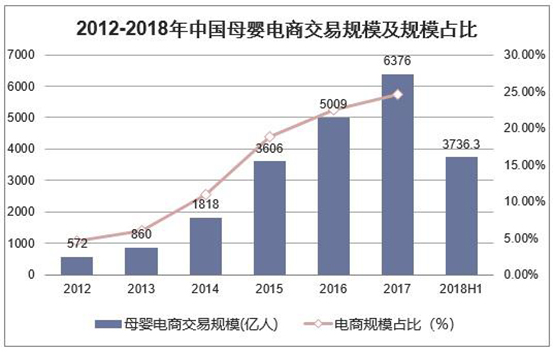 在需求拉動,多平臺布局及資本加持的促進(jìn)下,中國母嬰電商市場規(guī)??焖僭黾?。2018年上半年,母嬰店電商平臺隅田川、海拍客、海帶、PatPat和babytree紛紛獲得較大規(guī)模的融資,為平臺的發(fā)展提供了資本支持,同時推動了中國整體母嬰電商業(yè)的發(fā)展。2012-2017年,中國母嬰電商產(chǎn)品交易規(guī)模大幅增加,由2012年的572億元上升至2017年的6376億元,年均復(fù)合增長率為61.97%,規(guī)模增幅較快。至2018年上半年全國母嬰電商高交易規(guī)模為3736.3億元。