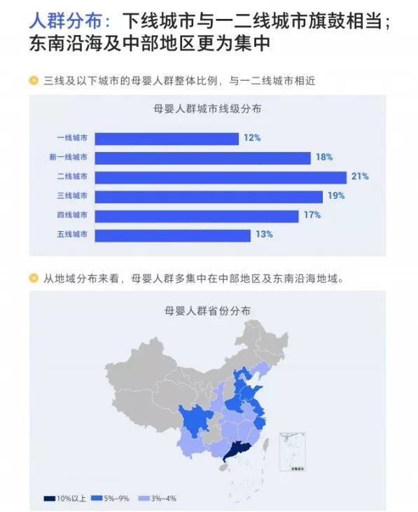 一方面,都市和小鎮(zhèn)的母嬰人群占比旗鼓相當(dāng);另一方面,從中部地區(qū),越往東部沿海,母嬰人群的分布越是密集。