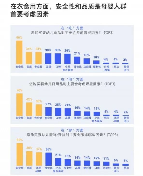 6、在衣食用方面,安全性和品質(zhì)是母嬰人群首要考慮因素