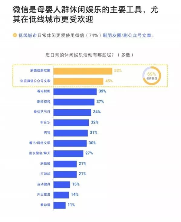 9、微信是母嬰人群休閑娛樂(lè)的主要工具,尤其在低線城市更受歡迎。低線城市日常休閑更愛(ài)使用微信(74%)刷朋友圈、刷公眾號(hào)文章。