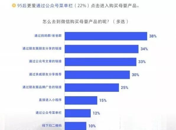 ·95后更愛(ài)通過(guò)公眾號(hào)菜單欄(22%)點(diǎn)擊進(jìn)入購(gòu)買母嬰產(chǎn)品。