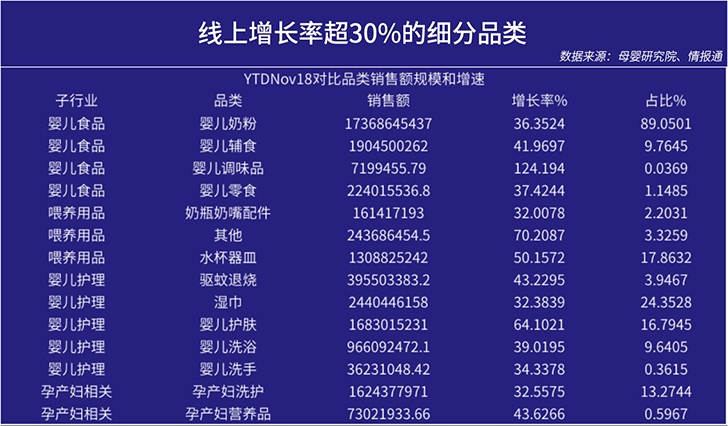 第四,細(xì)分為王,大而全、小而美同時(shí)并存。母嬰子行業(yè)規(guī)模在不斷擴(kuò)大,很多細(xì)分品類(lèi)增長(zhǎng)率是非常高的,其中線上增長(zhǎng)超過(guò)30%的細(xì)分品類(lèi)非常多,如奶粉、輔食、奶瓶、濕巾等。