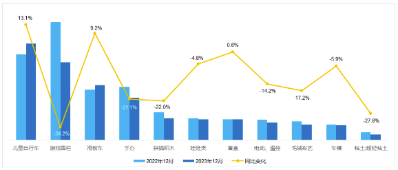 從均價(jià)來看,12月份同比增長的玩具主要品類有兒童自行車(13.1%)、滑板車(9.2%)、盲盒(0.6%),同比增長的嬰童用品主要品類有奶瓶(1.2%)。